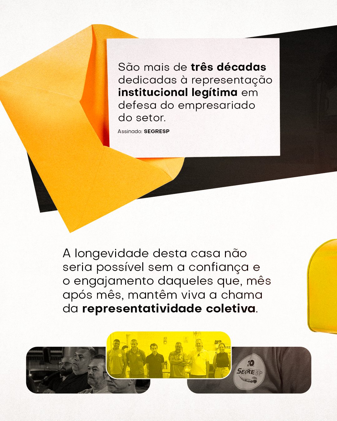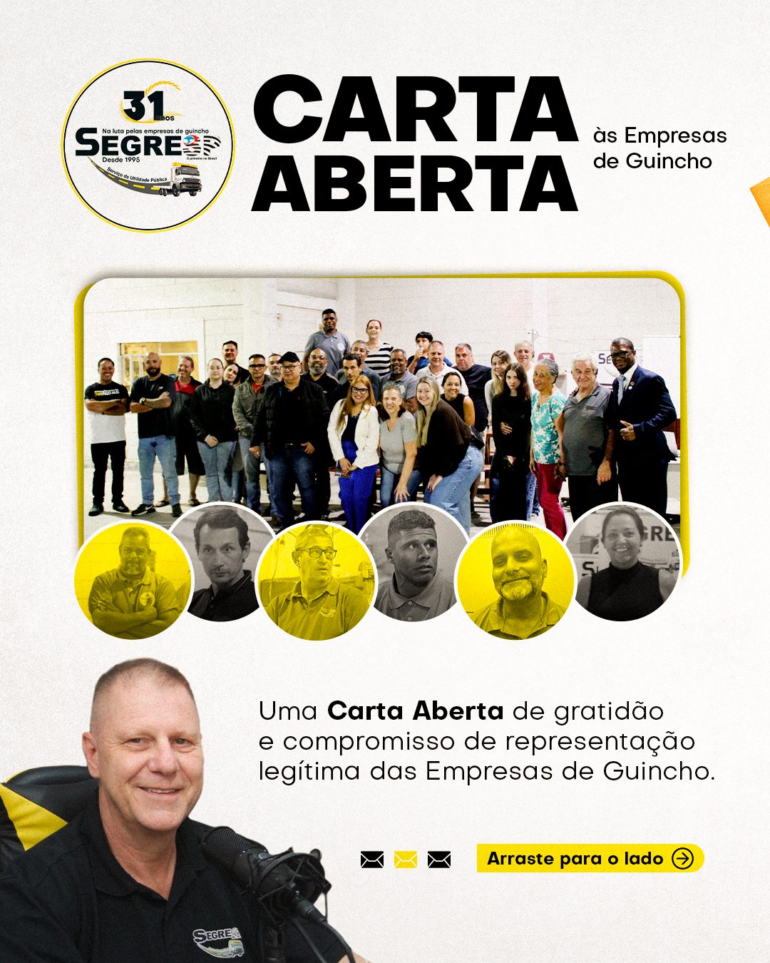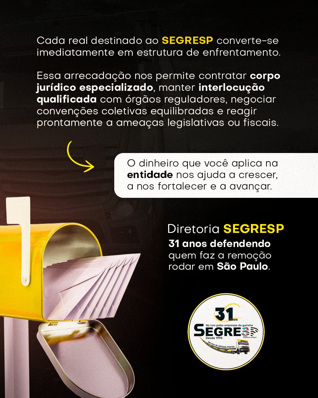 O Sindicato das Empresas e Proprietários de Serviços de Reboque, Resgate, Guincho e Remoção de Veículos no Estado de São Paulo completou em março 31 anos de existência. São mais de três décadas dedicadas à representação institucional legítima em defesa do empresariado do setor. A longevidade desta casa não seria possível sem a confiança e o engajamento daqueles que, mês após mês, mantêm viva a chama da representatividade coletiva. Por isso, esta mensagem se dirige, com transparência e reconhecimento, a cada associado e empresário que mensalmente, sustentam financeiramente esta instituição. Sem essa contribuição, simplesmente não haveria SEGRESP para defender ninguém.